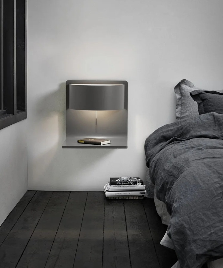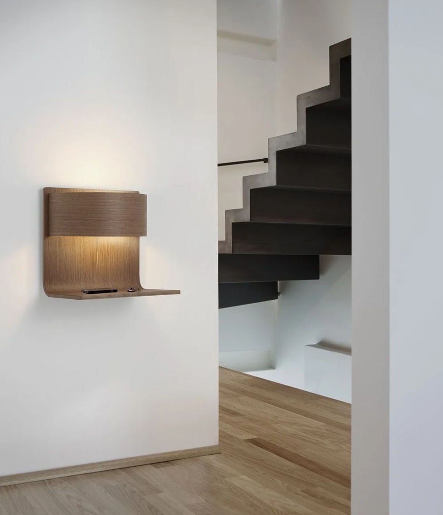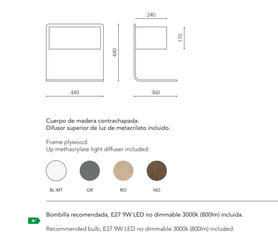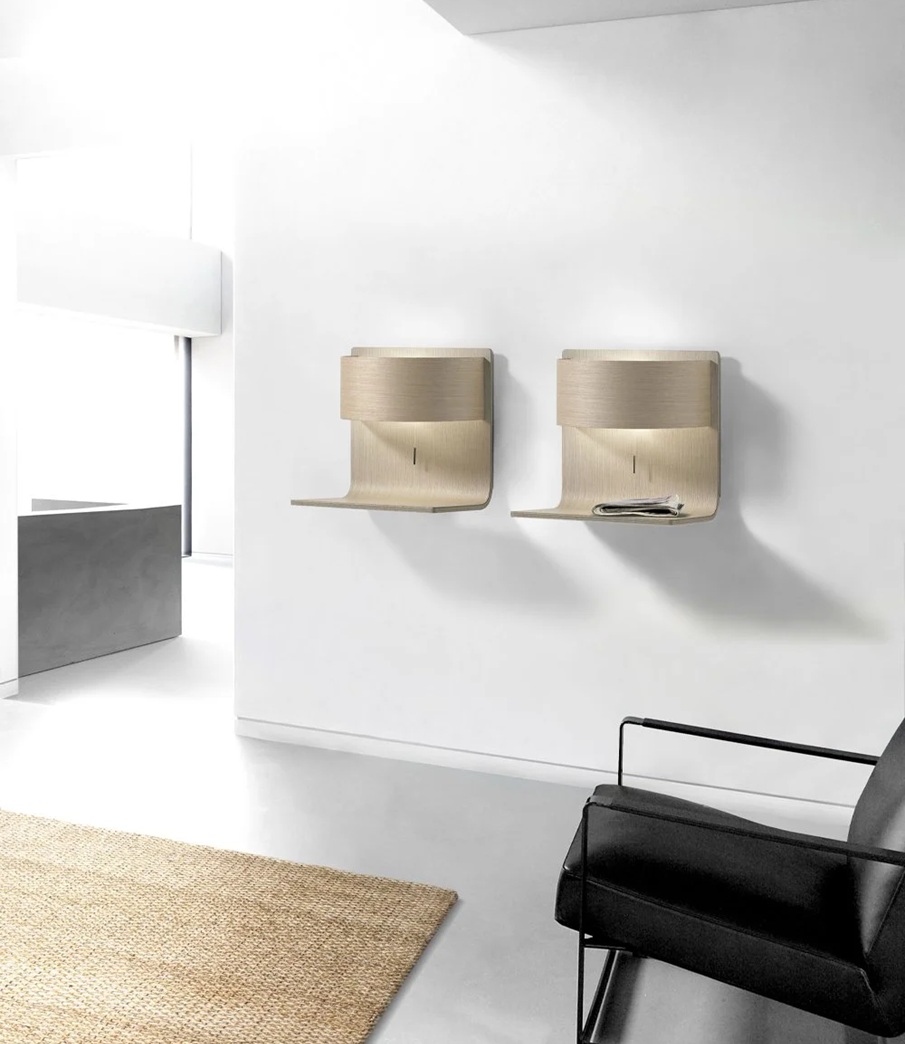 Es una lámpara conceptual que respira un marcado estilo contract, surge de la idea de fusionar mesitas de noche y la lamparita que se sitúa encima, de líneas puras y realizada con dos piezas de madera curvada, lacada de colores o no.