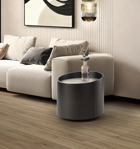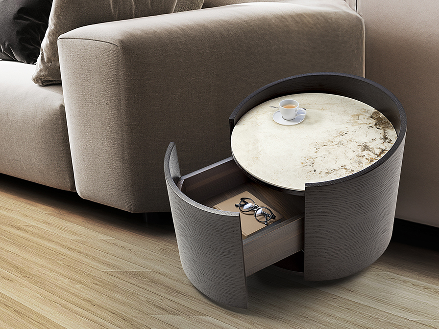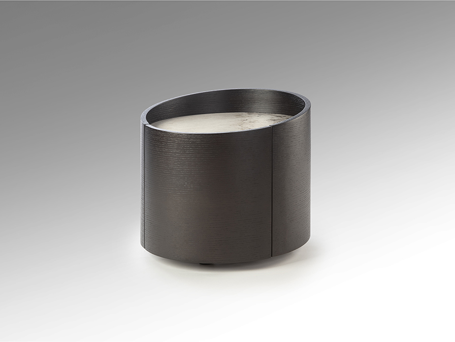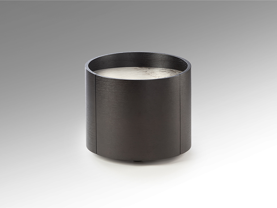 Mesita de noche redonda con un cajón y tapa en porcelánico