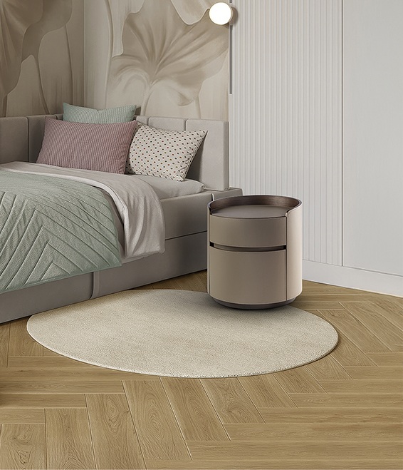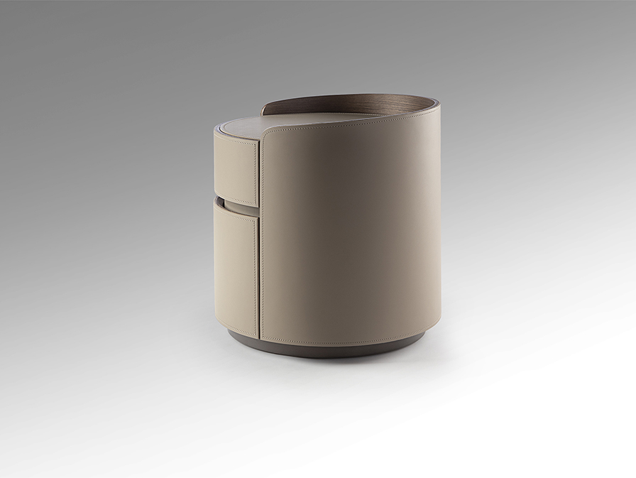 Material: Realizada en madera contrachapada de nogal, forrada con cuero beige.
