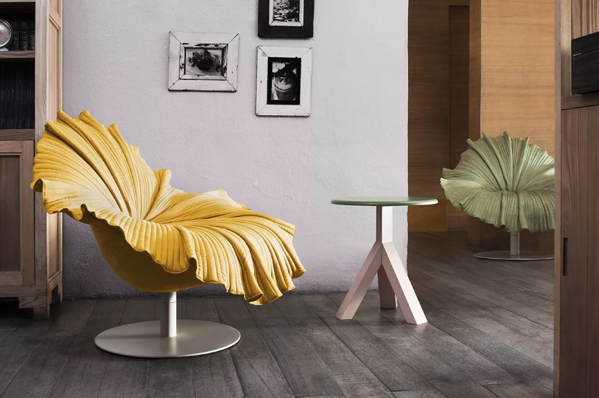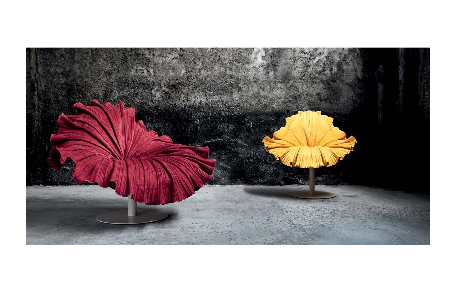 Como brotes que florecen en un hermoso y colorido ramo, la silla Bloom se ancla y ensambla desde el centro con cien elegantes y finos pliegues que imitan grandes pétalos.