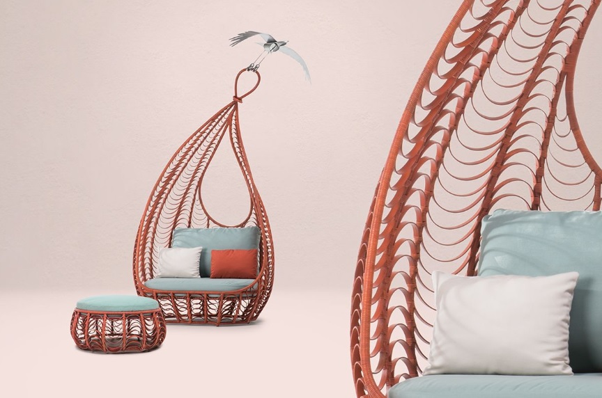 Ondas de tiras de ratán o polietileno, cuidadosamente dobladas en diferentes anchos y enrolladas alrededor de una estructura de acero, simulan el movimiento del viento.