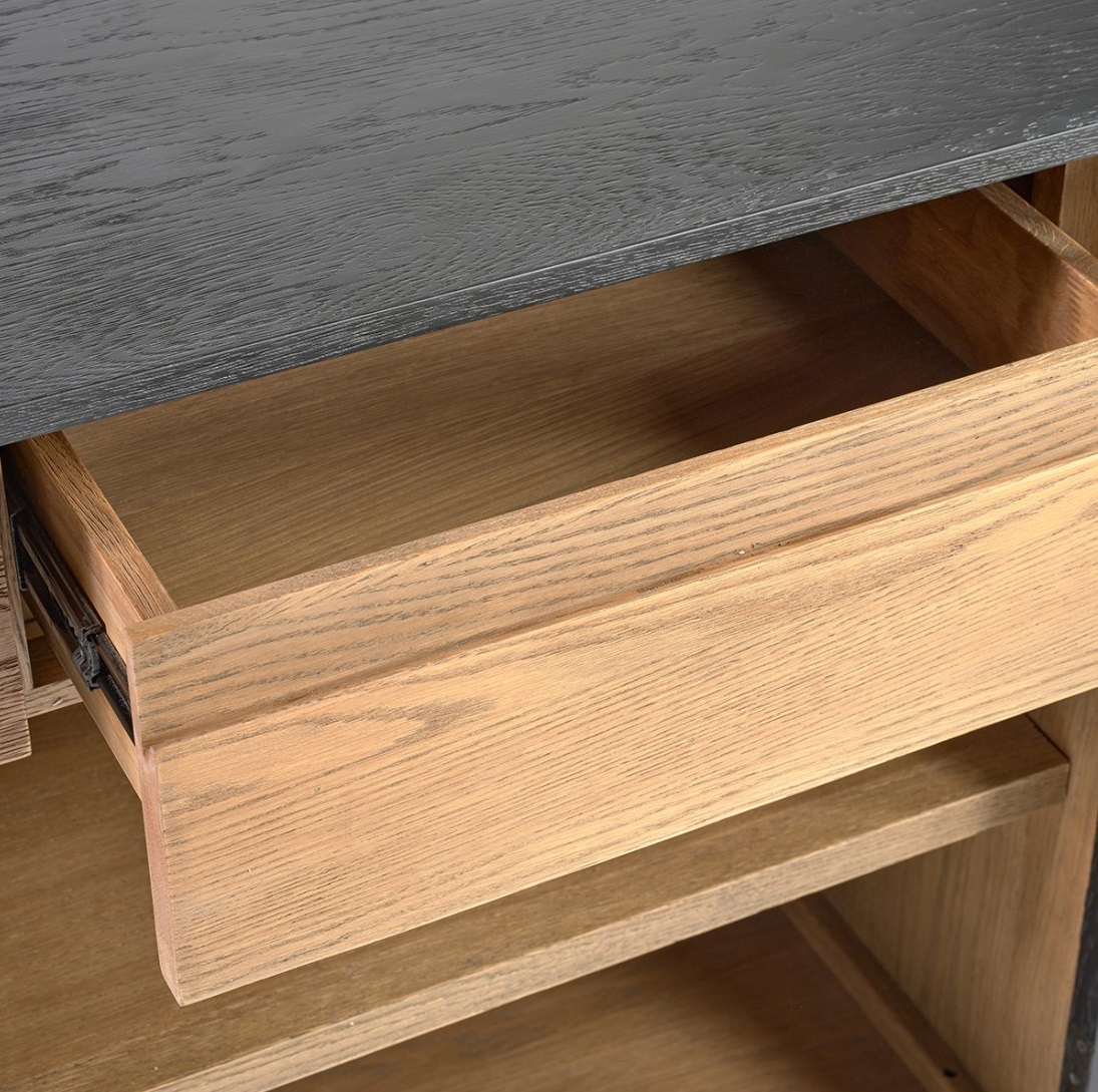Aparador de madera de roble color oscuro con interior en tono natural.
