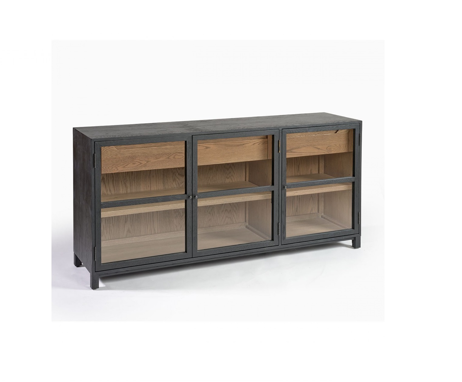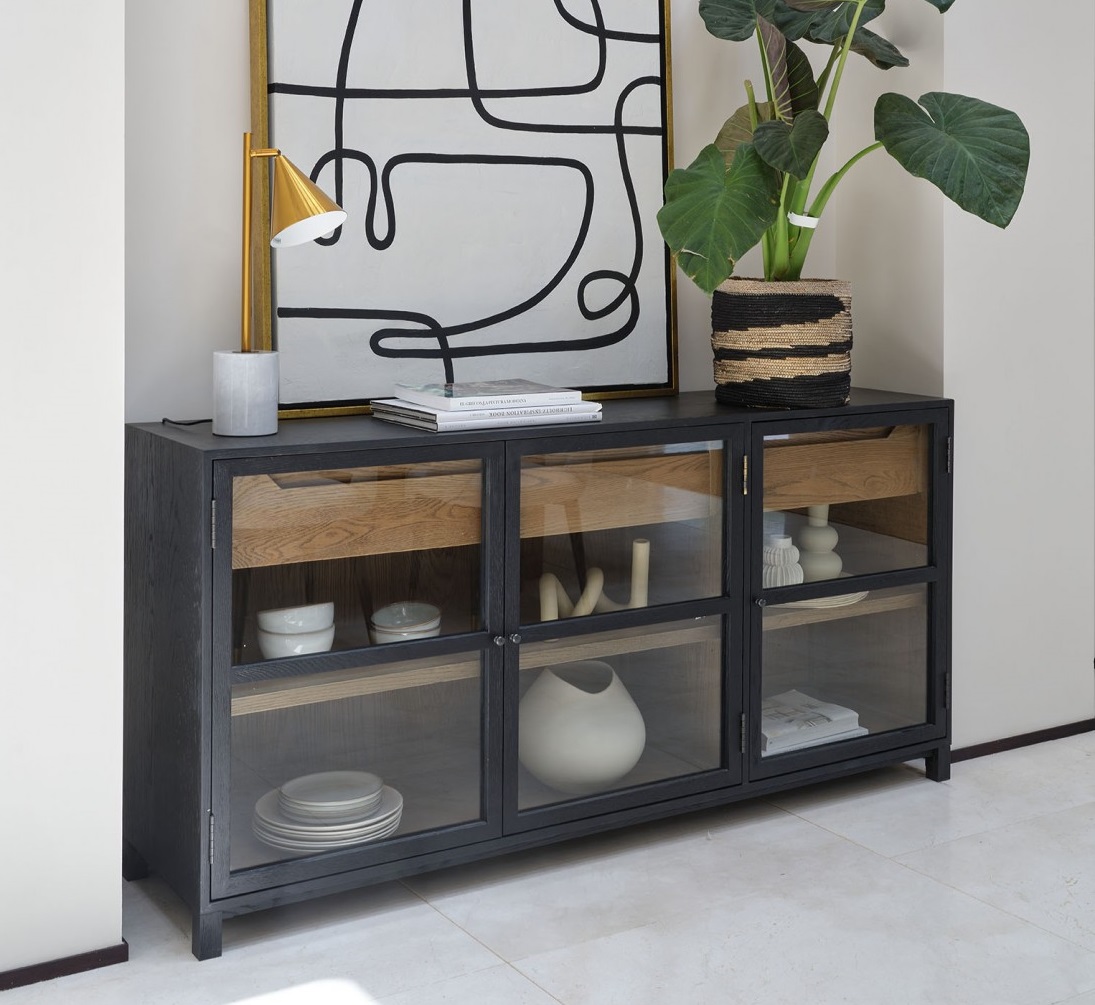 Aparador con puertas de madera y cristal que dejan ver el interior del mueble y sus elementos decorativos.
