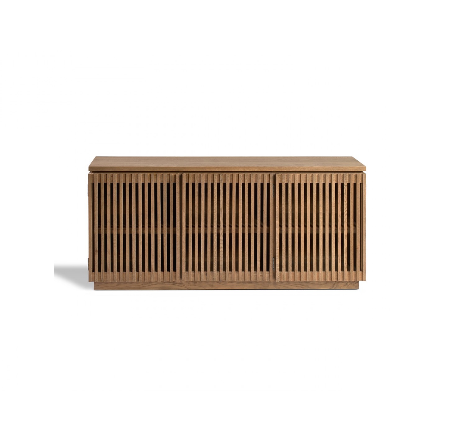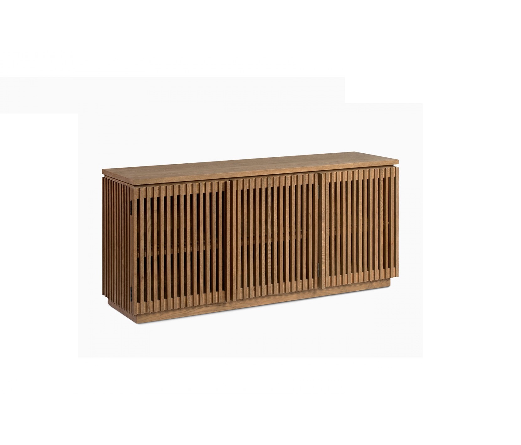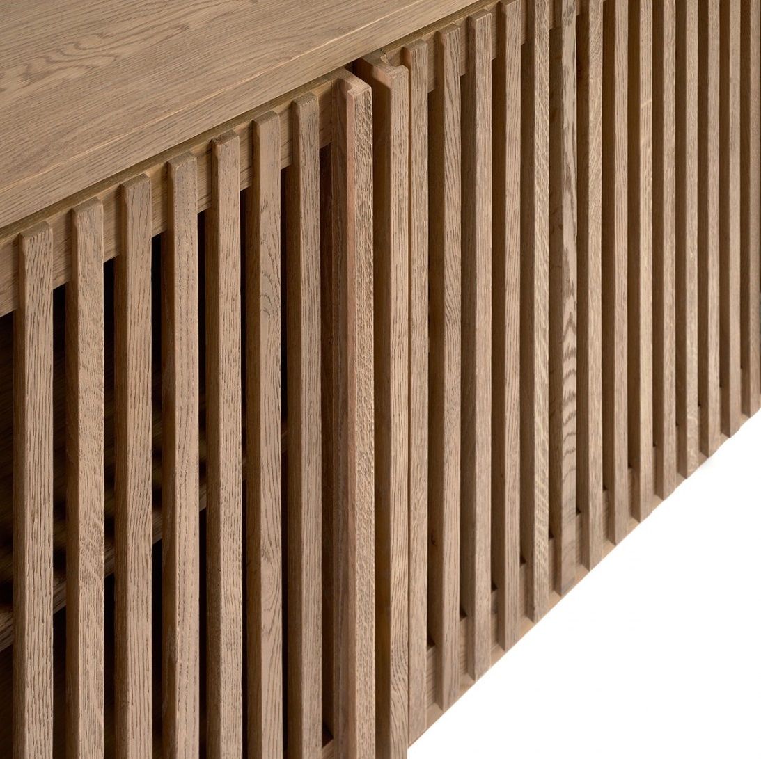 Aparador acabado en madera de roble en tono natural con puertas alistonadas.