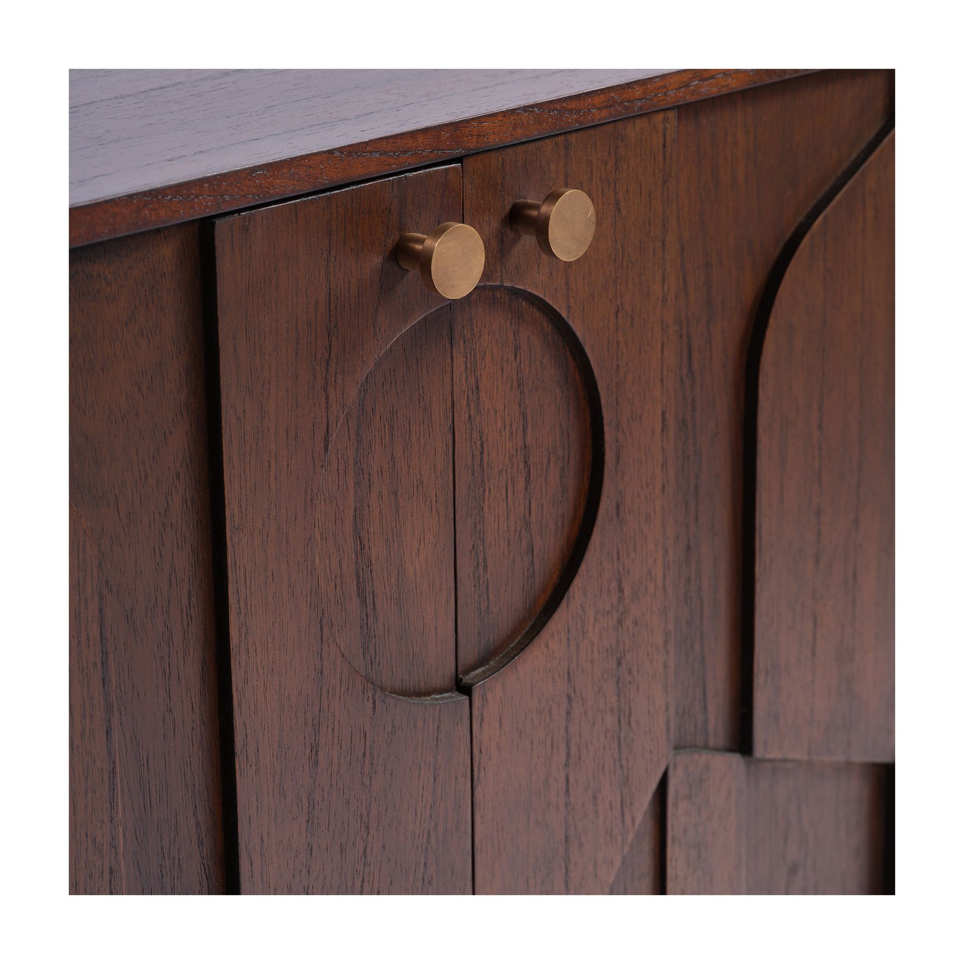 Aparador de madera color café con 4 puertas. Los frontales cuenta con relieves en formas geométricas que dan originalidad a la pieza.