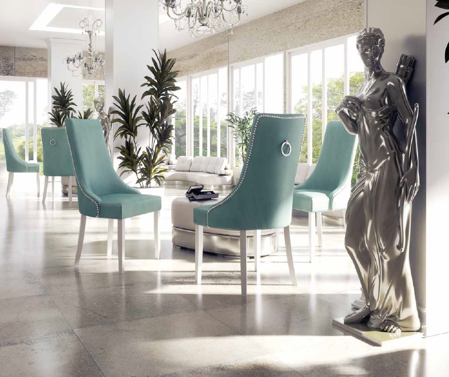 - SILLA TAPIZADA CON TACHUELAS Y ANILLA EN RESPALDO