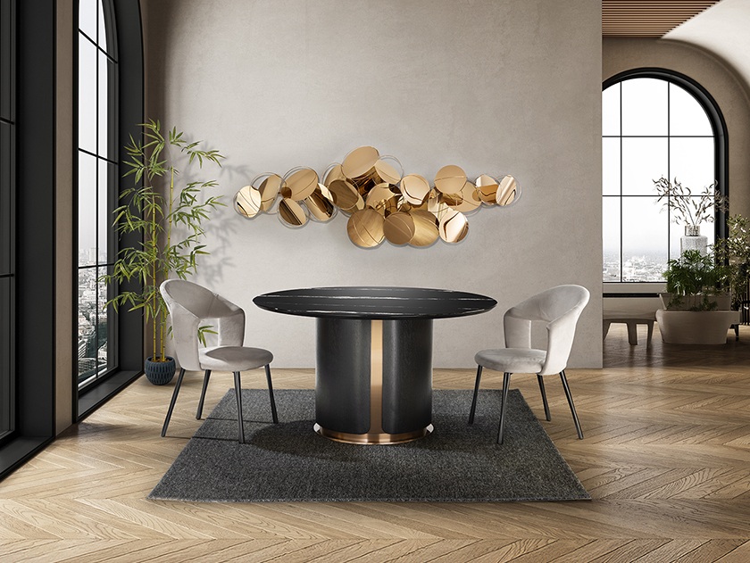 Material: Mesa de comedor redonda realizada chapado de roble oscuro, acero inoxidable acabado oro rosa