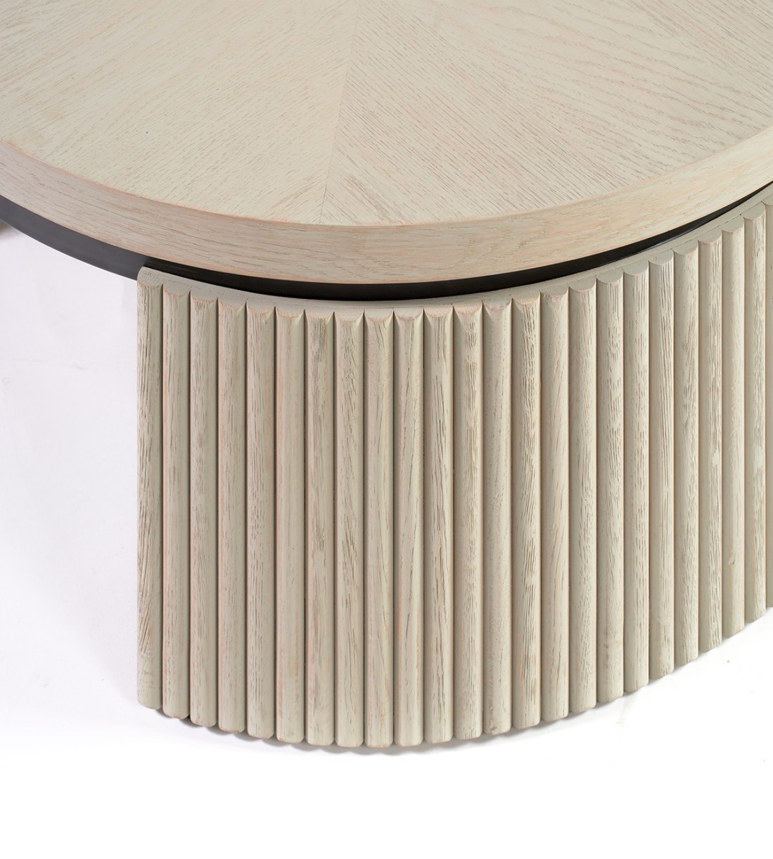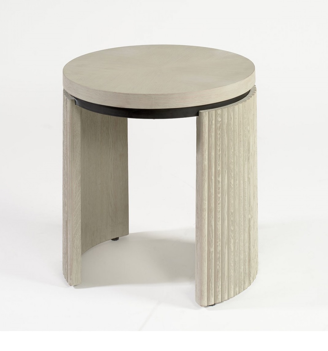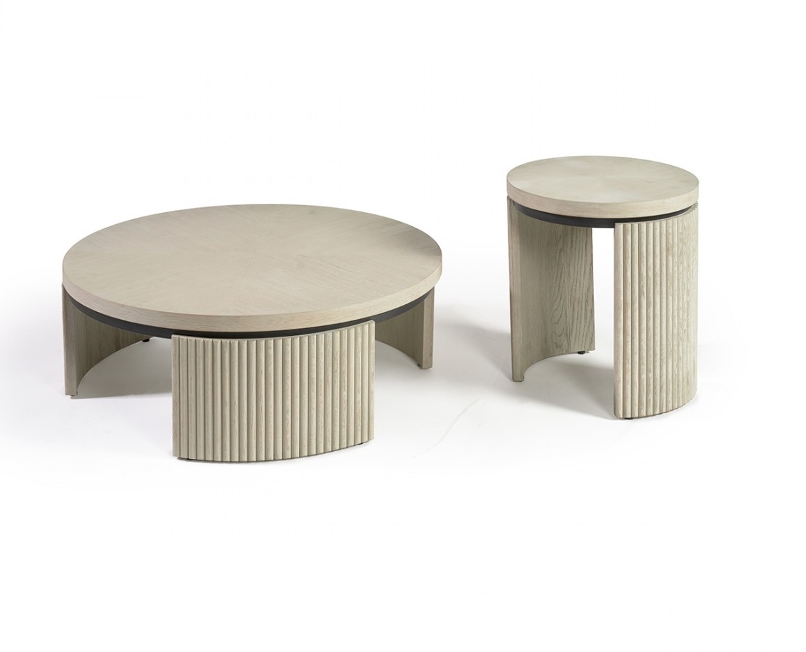 Mesa de centro redonda acabada en roble blanco grisáceo y metal negro.