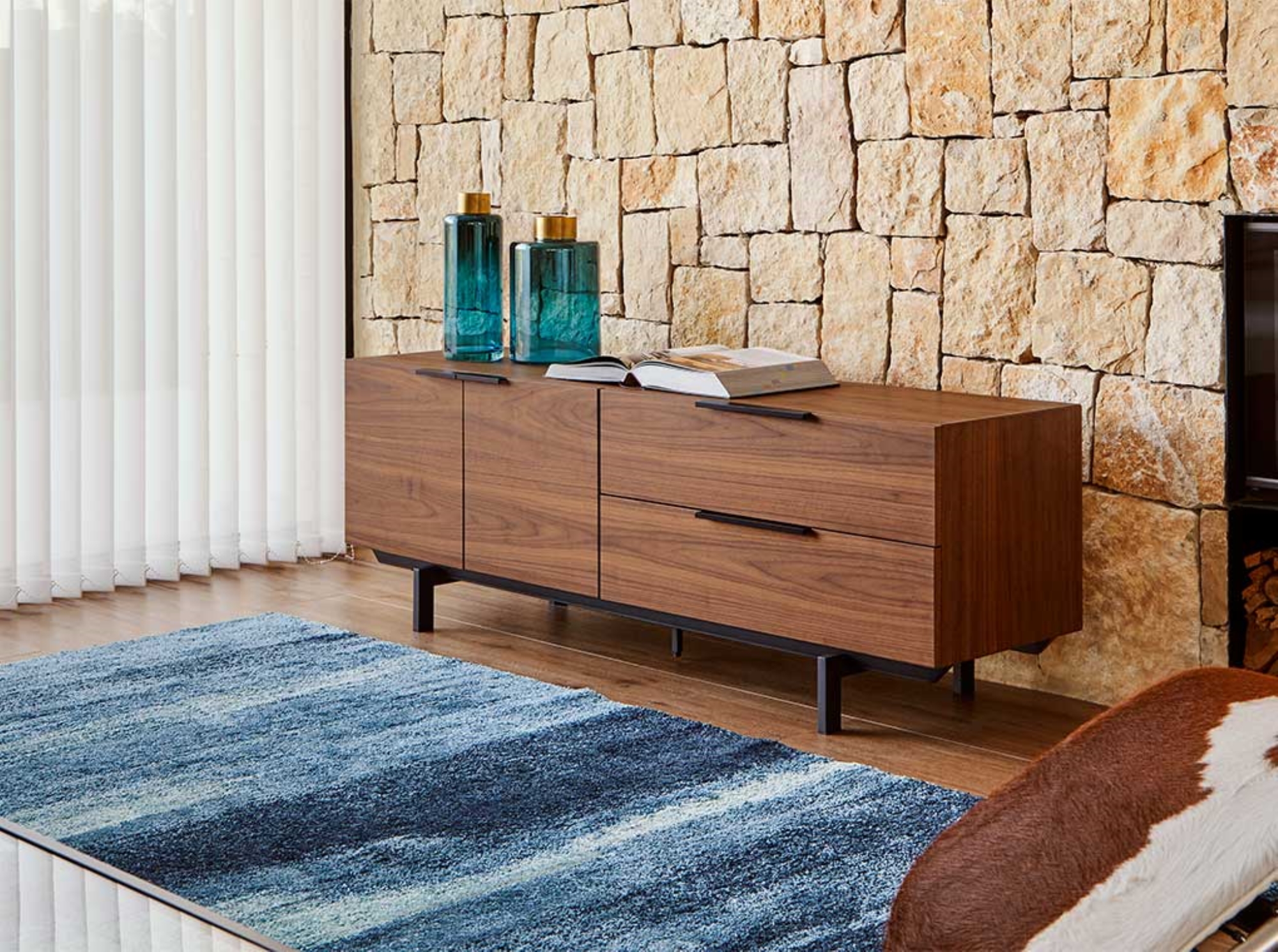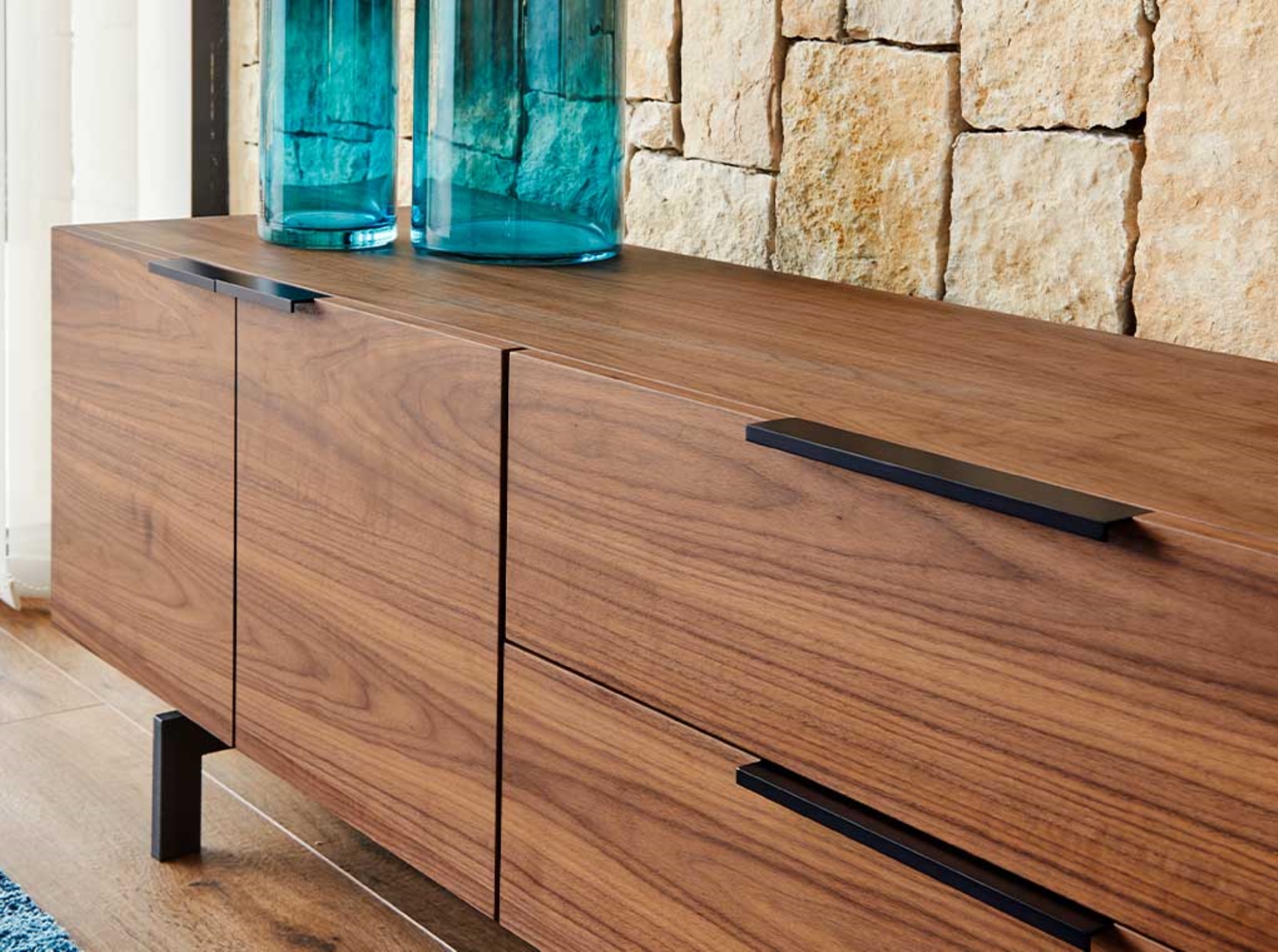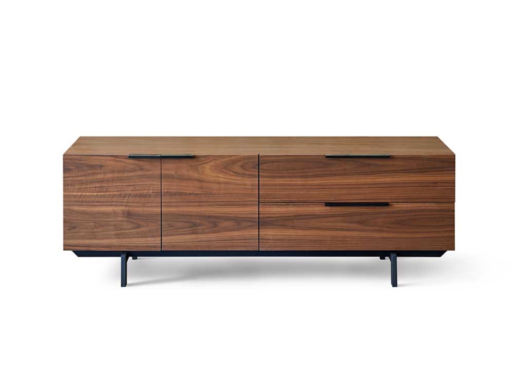 Módulo TV de dos puertas y dos cajones en MDF acabado en chapa de nogal.