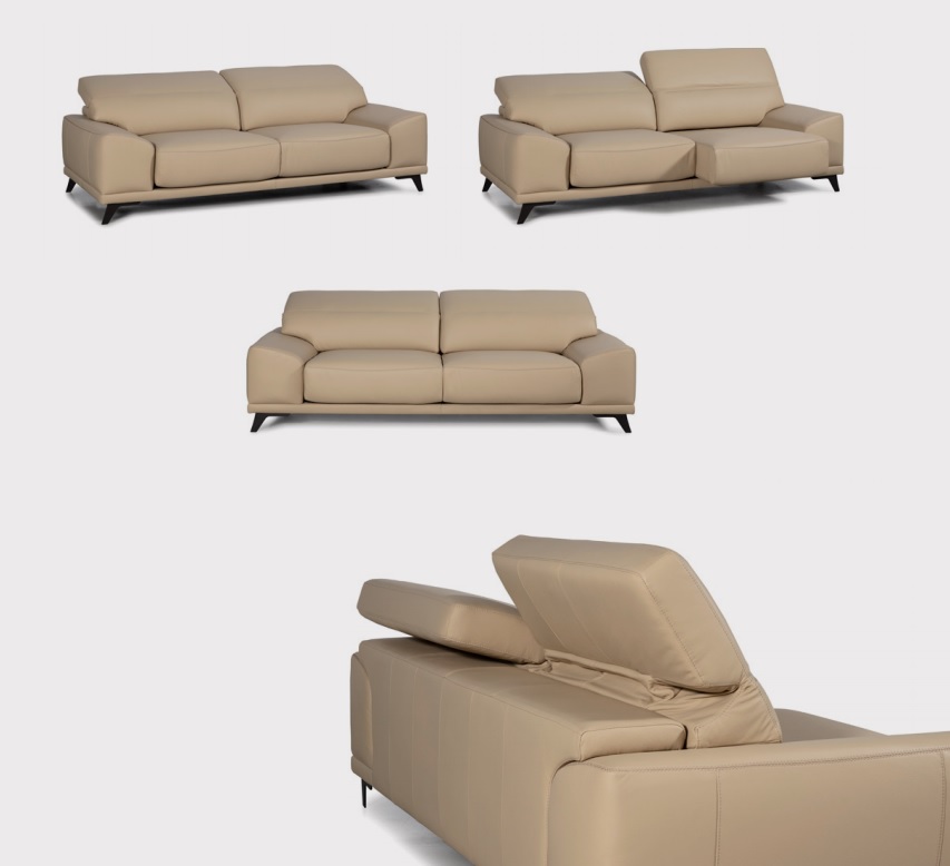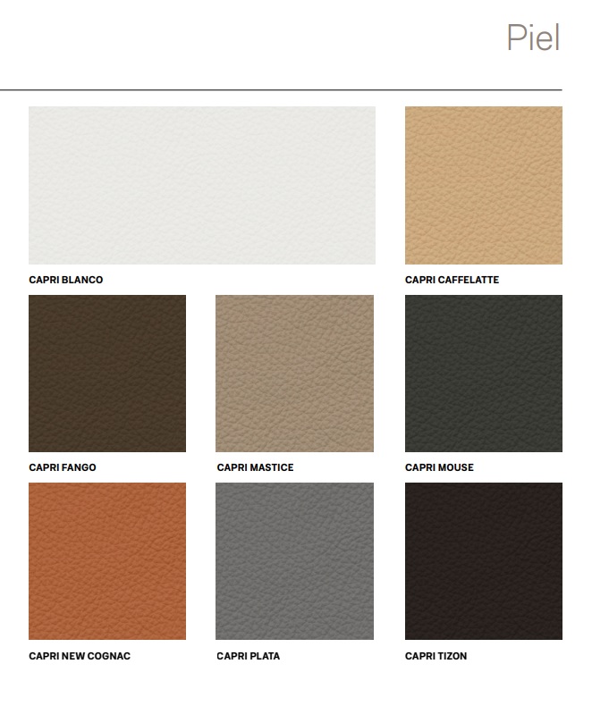 Tapizados en Piel 100% bovina grabada. La piel Capri es una piel caracterizada por su aspecto natural y semiopaco, una mano blanda y un tacto ceroso. Diferentes terminaciones de color.